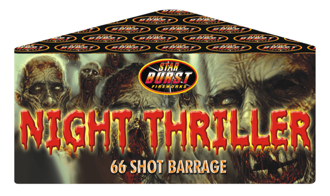 A great seller during Halloween. Night Thriller produces some spooky colours and effects alternating between green comet tail with a purple & green peony star burst, silver comet tail with silver glitter peony star bursts, red comet tail to blue peony star burst.