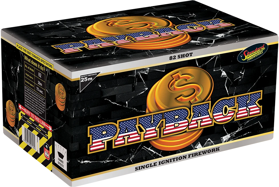 Payback packs a punch for it’s size. Producing a dazzling array of effects. Coloured tails rise to silver palm bursts with red, green and orange stars accompanied by a constant flurry of white blink. Red and green tails rise to burst of red and green peony with crackling flowers, gold tails rise to gold brocade bursts with red. green and blue stars followed by a brilliant fanned finale of red strobe tails to red swimming stars and green tails to green swimming stars.