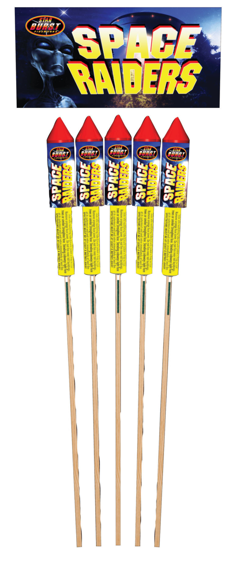5 assorted rockets producing either a silver glitter, green glitter, golden glitter, crackling stars or red peony burst.