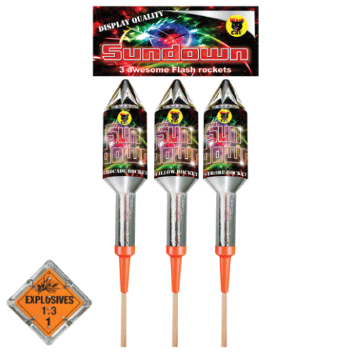 3 powerful multi-effect rockets with loud bangs and huge burst effects of dazzling snowflake brocade, brilliant strobe and weeping willow.
