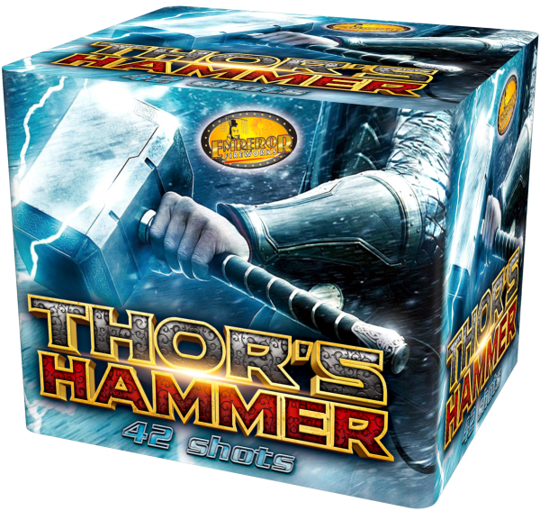 Feel the impact of the Viking God’s Hammer! Red Shot Bursting into Red Coconut with Timed Rain, Green Shot Exploding into Green Coconut with Timed Rain, Lightening Blue Shot Breaking into Red and Blue Peony, Red Shot Producing Silver Coconuts with Contrasting Red Stars, Green Shot Bursting into Golden Willow with Blue Stars, Red Shot Exploding into Purple and Green Glitter with Thunderous Finale of Crackling Tailed Comets into Crackling Chrysanthemum.